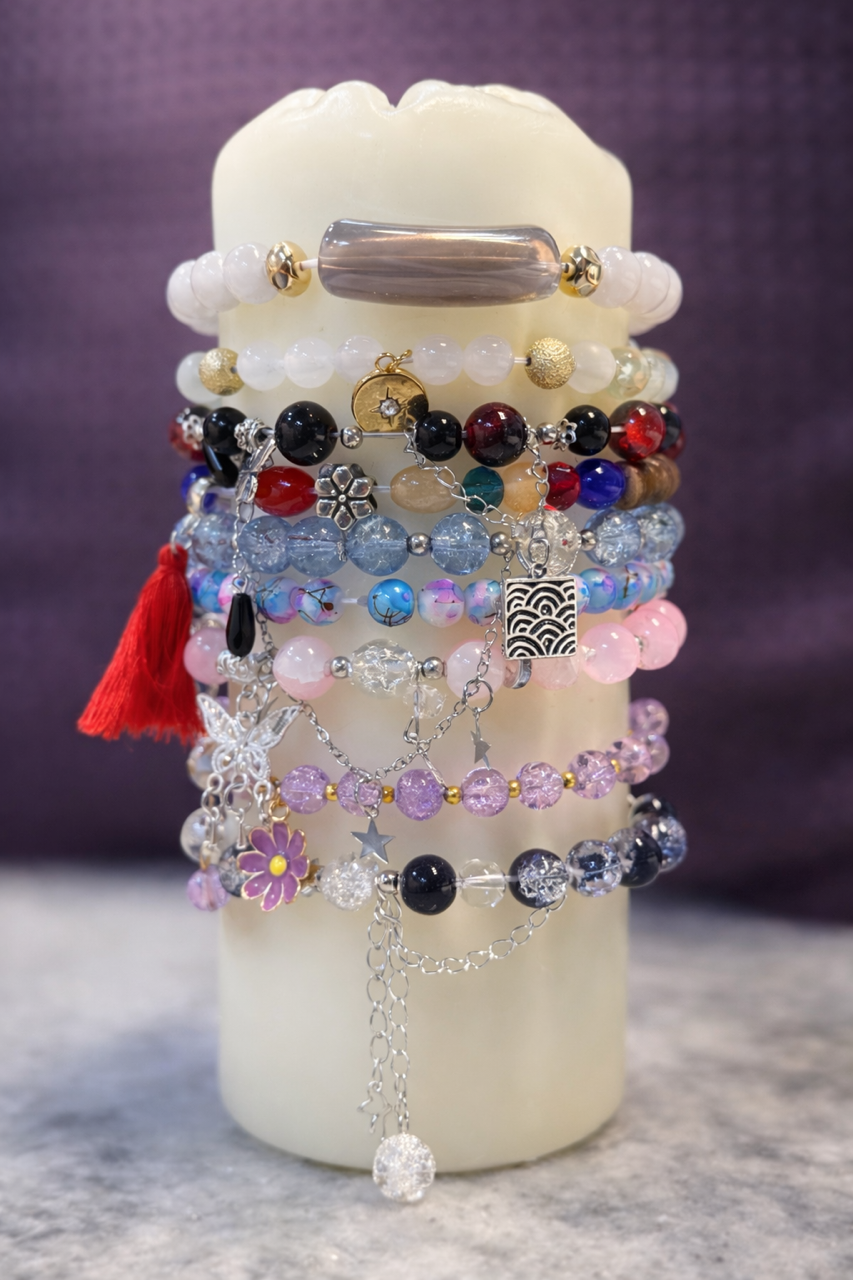 Our concept is simple, original, and fun: you purchase a scoop — a spoon ful of crystals — and based on the blue gems and sparkles drawn, we send you sealed mystery bags containing your bracelets.
